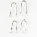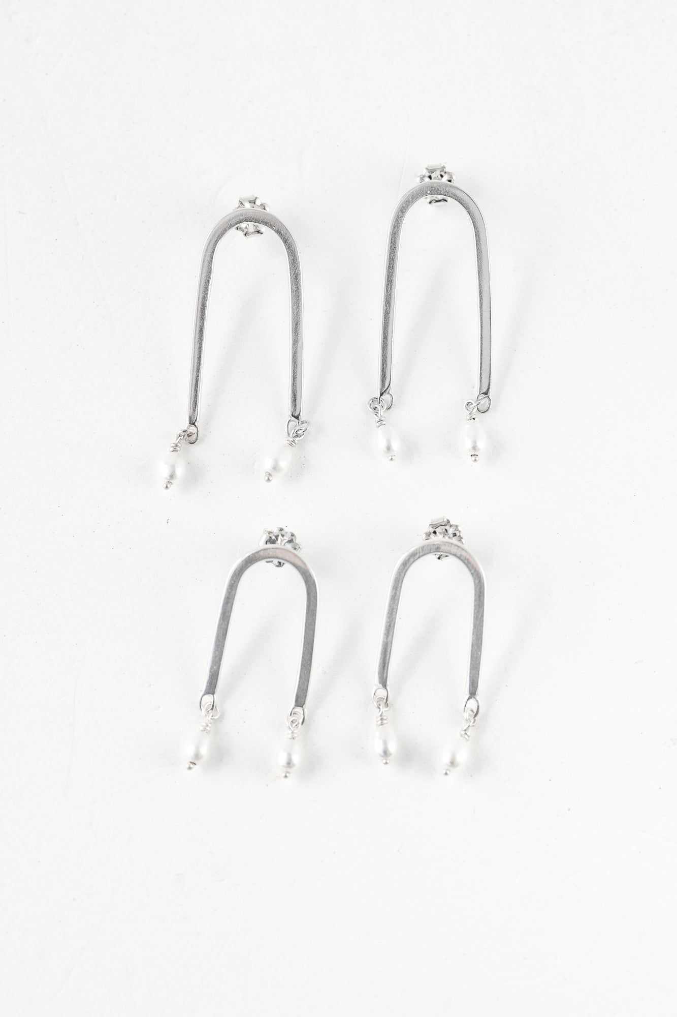 These arching ellipses adorned with delicate pearls add a subtle elevation to any style. Hanging from a half ellipse the pearls add a fun, playful element to any outfit.