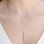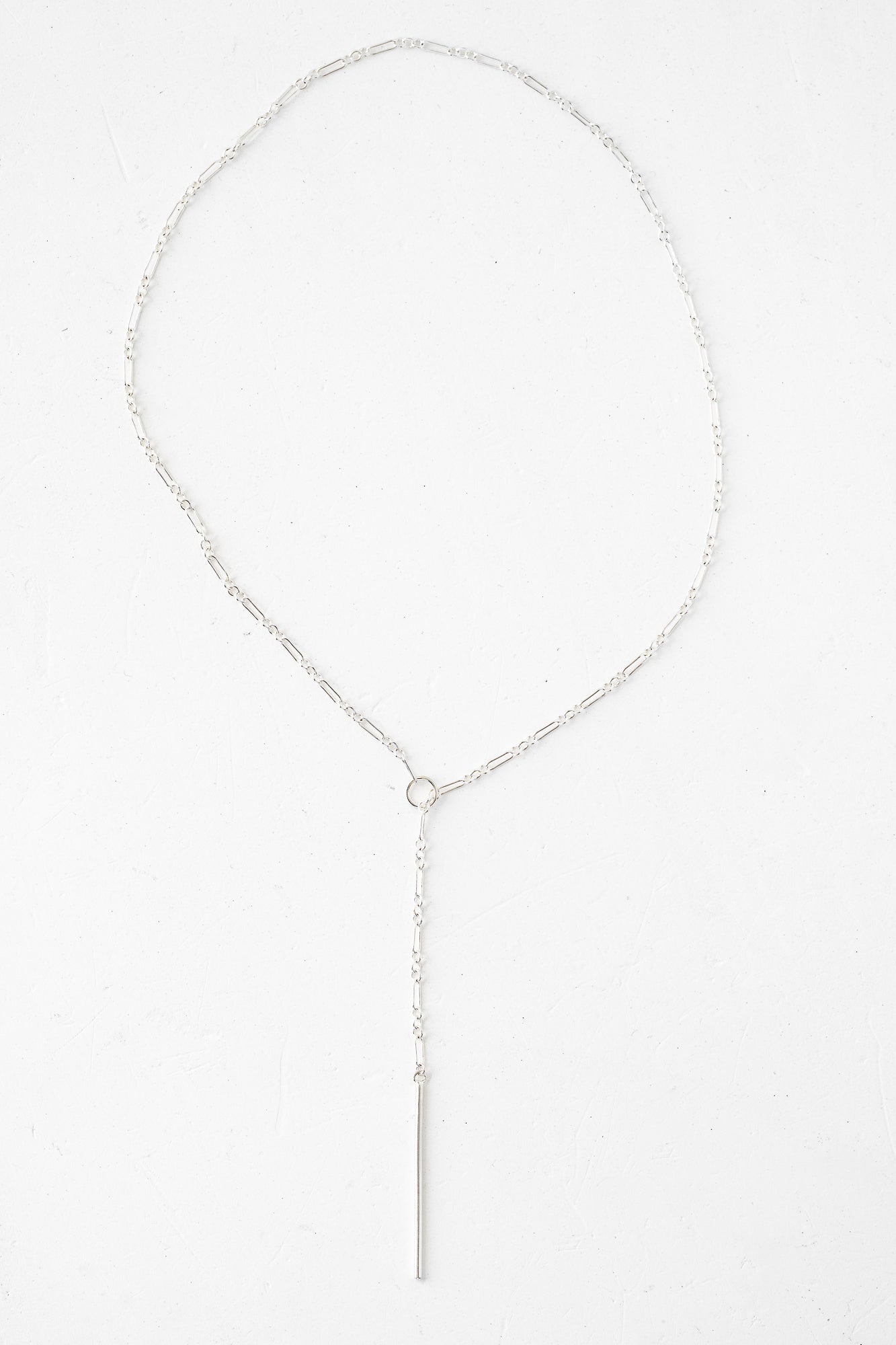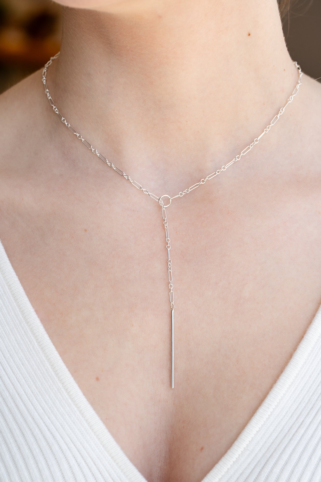 Elevate your everyday look with this sleek and modern chain lariat necklace, featuring a polished vertical bar that adds a sophisticated edge. Whether worn alone for a minimalist statement or layered with your favorite pieces, this necklace transitions seamlessly from day to night. Perfect for adding a touch of shine to plunging necklines or structured collars.