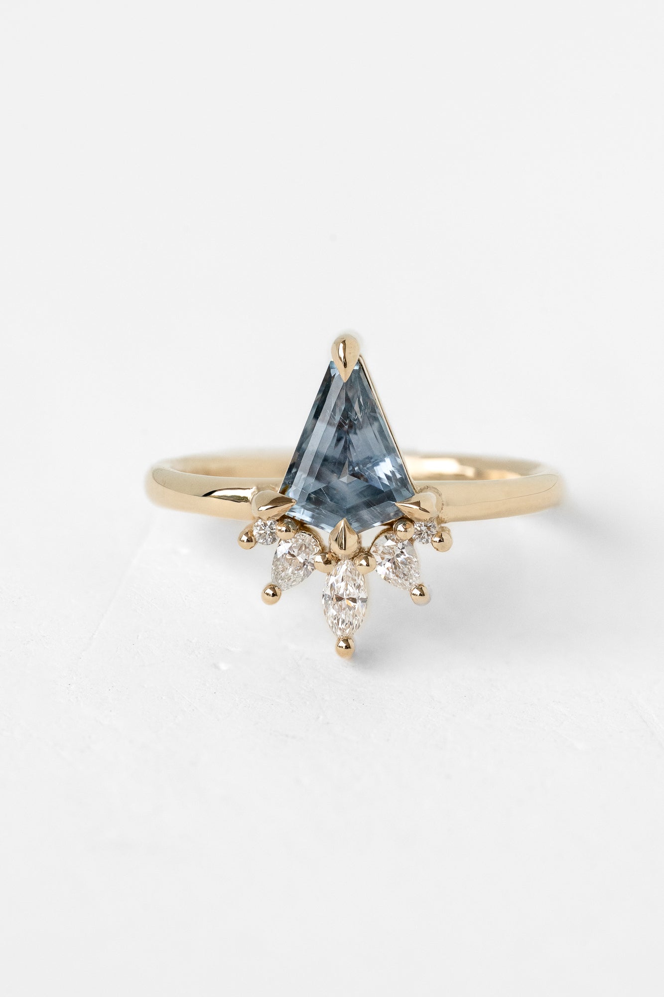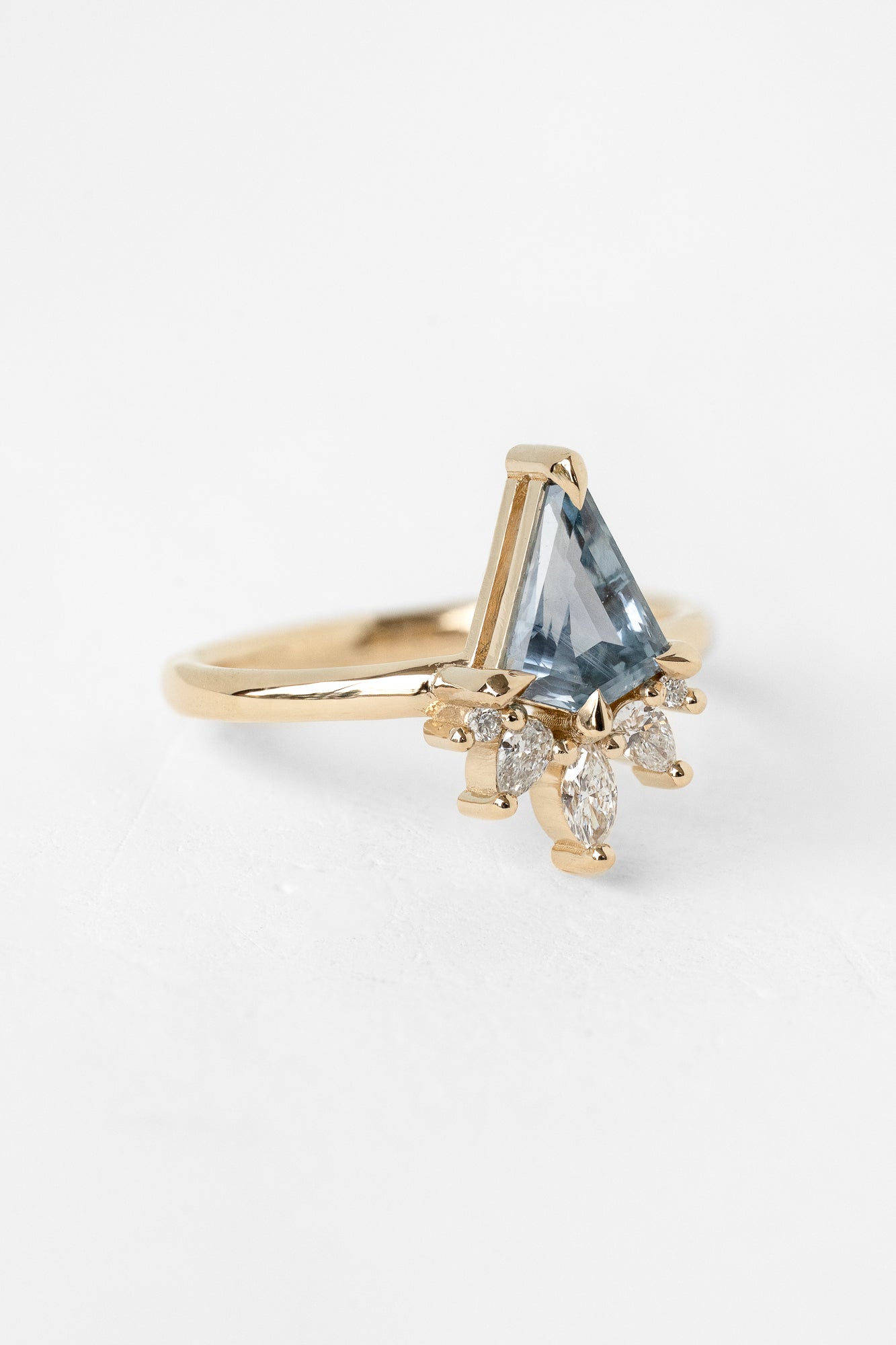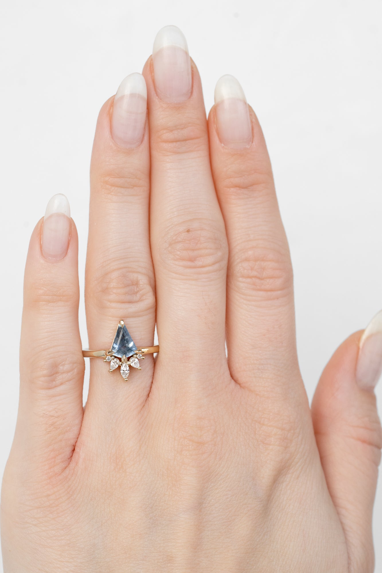 Just as the sky represents endless possibilities, this ring speaks to the boundless potential of your connection. The kite sapphire and sparkling sunburst are a deep reminder of mystical moments and magical experiences. With each wear, you're reminded that love knows no limits, and your shared dreams can take flight in harmony. Handmade with 14k gold and ethically sourced stones, this ring embodies soaring aspirations lifetime of love.