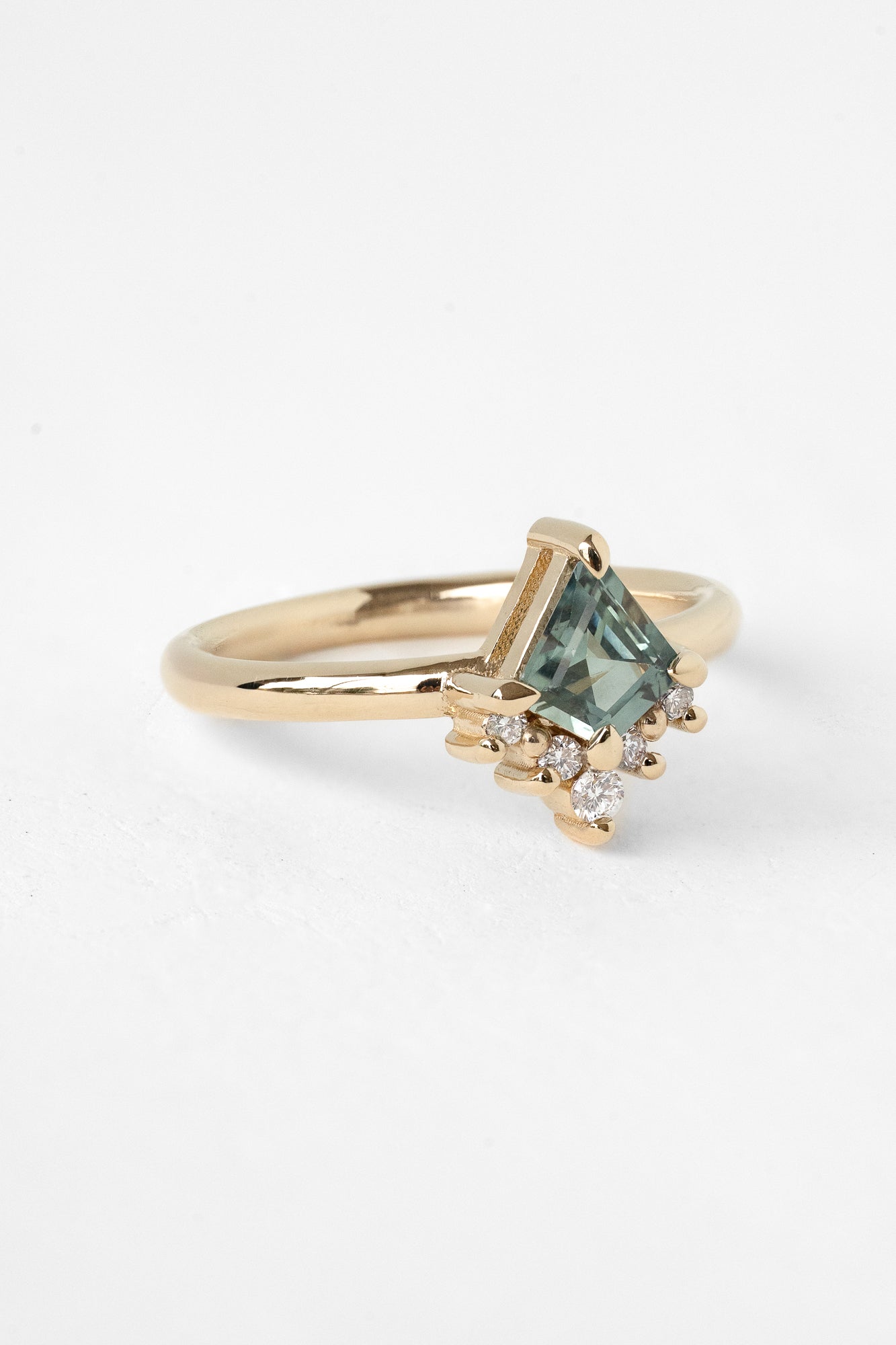 For this ring we've set a sea green Montana sapphire. Mined by our friends on the Eldorado Bar, these fascinating stones change color with the light as well. Learn more about Montana sapphires.