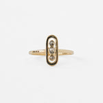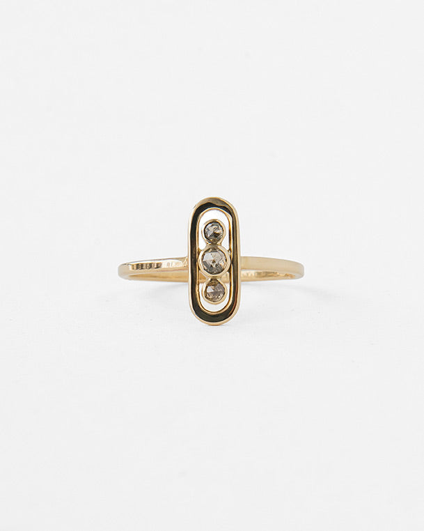Modern minimalism meets organic beauty in this striking salt and pepper diamond ring. Three round salt and pepper diamonds are arranged vertically within a sleek, elongated oval bezel frame. Perfect for stacking or wearing solo, this ring adds understated sparkle to any look.