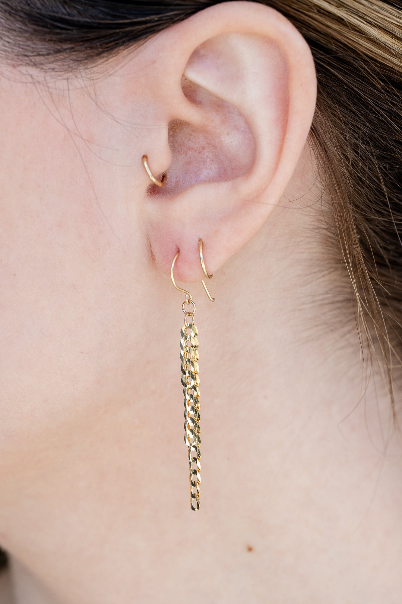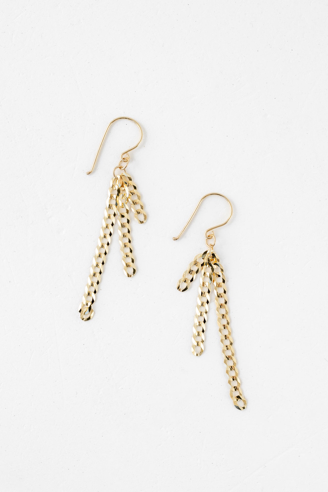 Designed to move with you, each earring features a cascade of fine gold chains suspended from a polished ear hook, creating a shimmer effect with every step. Lightweight yet striking, these earrings add dimension and depth to any look.