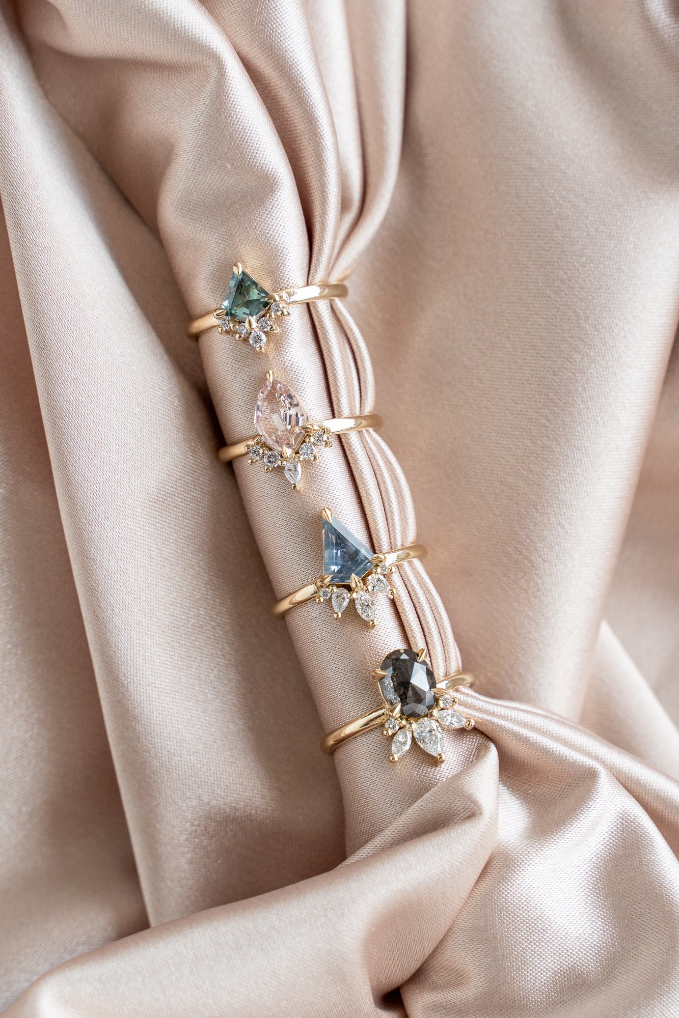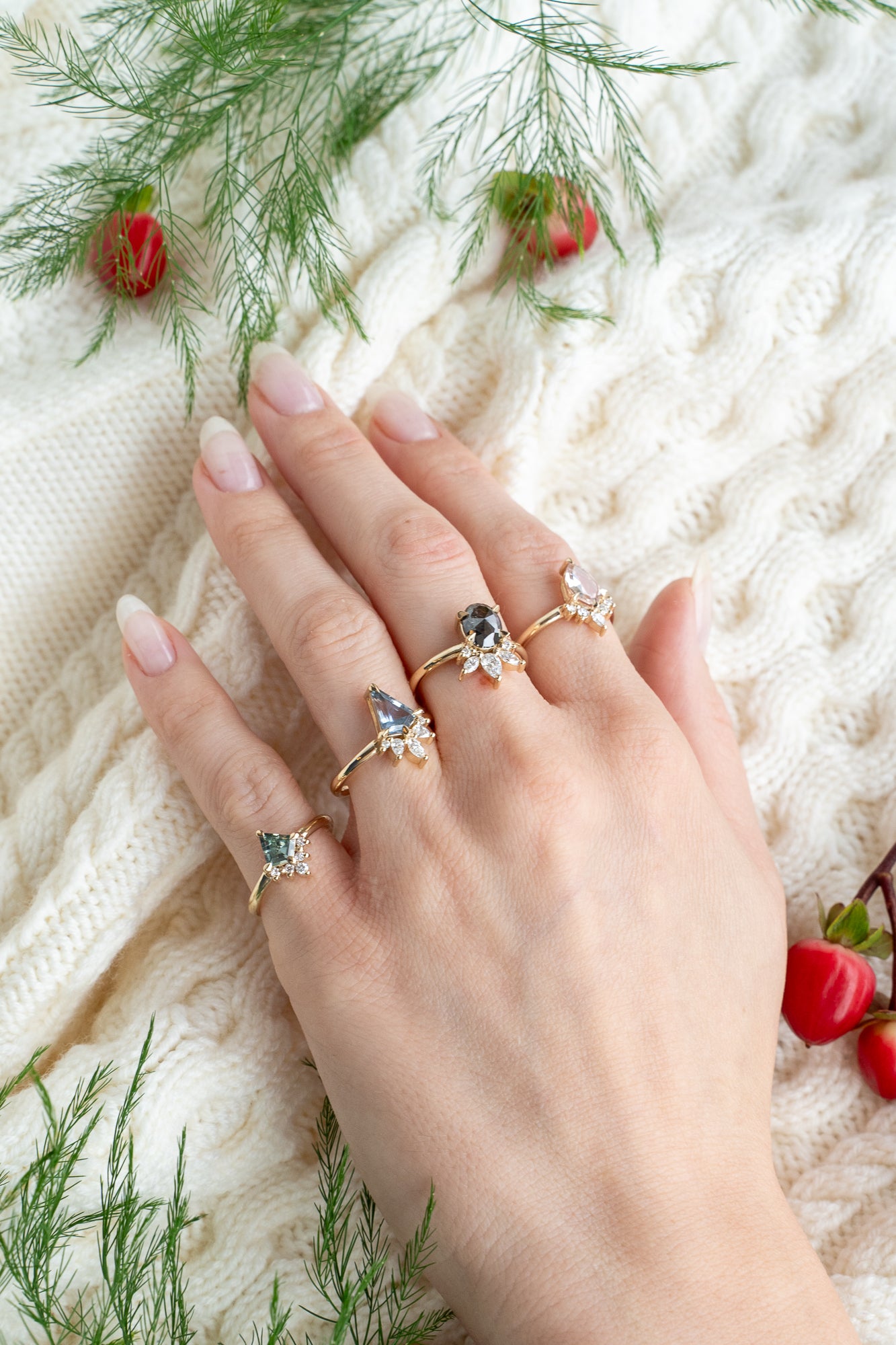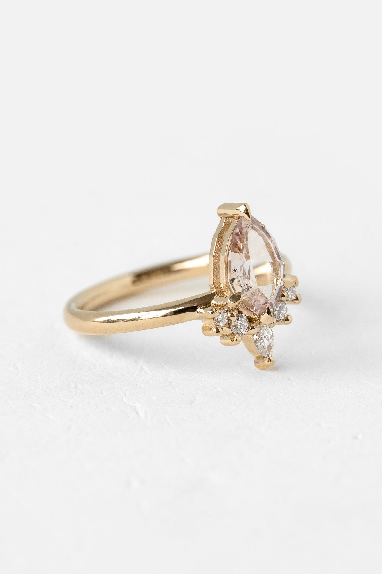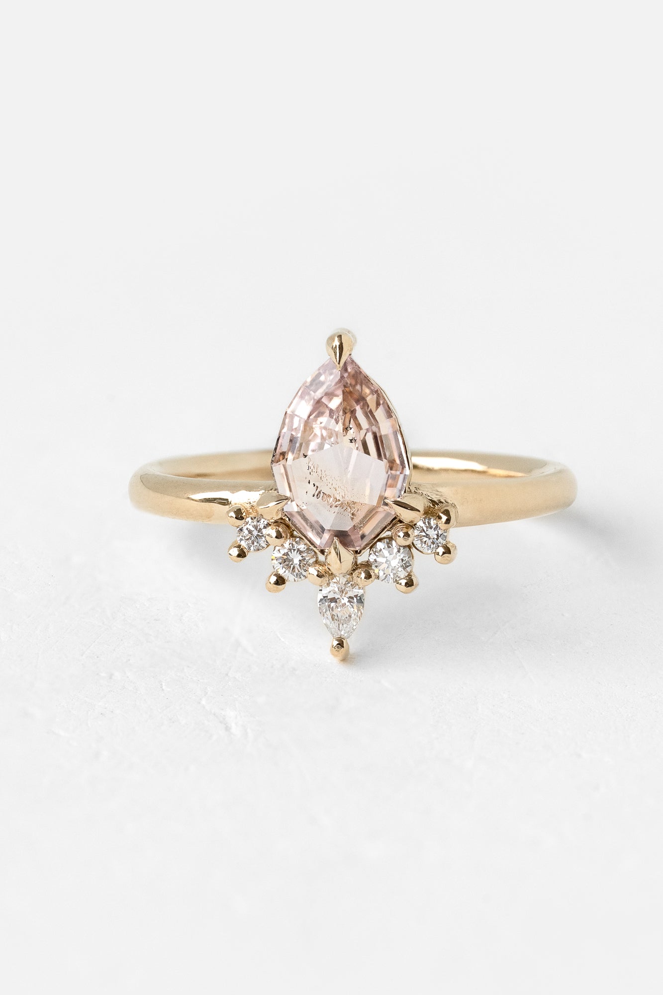Just as the sky represents endless possibilities, this ring speaks to the boundless potential of your connection. The pale pink sapphire and sparkling sunburst are a deep reminder of mystical moments and magical experiences. With each wear, you're reminded that love knows no limits, and your shared dreams can take flight in harmony. Handmade with 14k gold and ethically sourced stones, this ring embodies soaring aspirations lifetime of love.