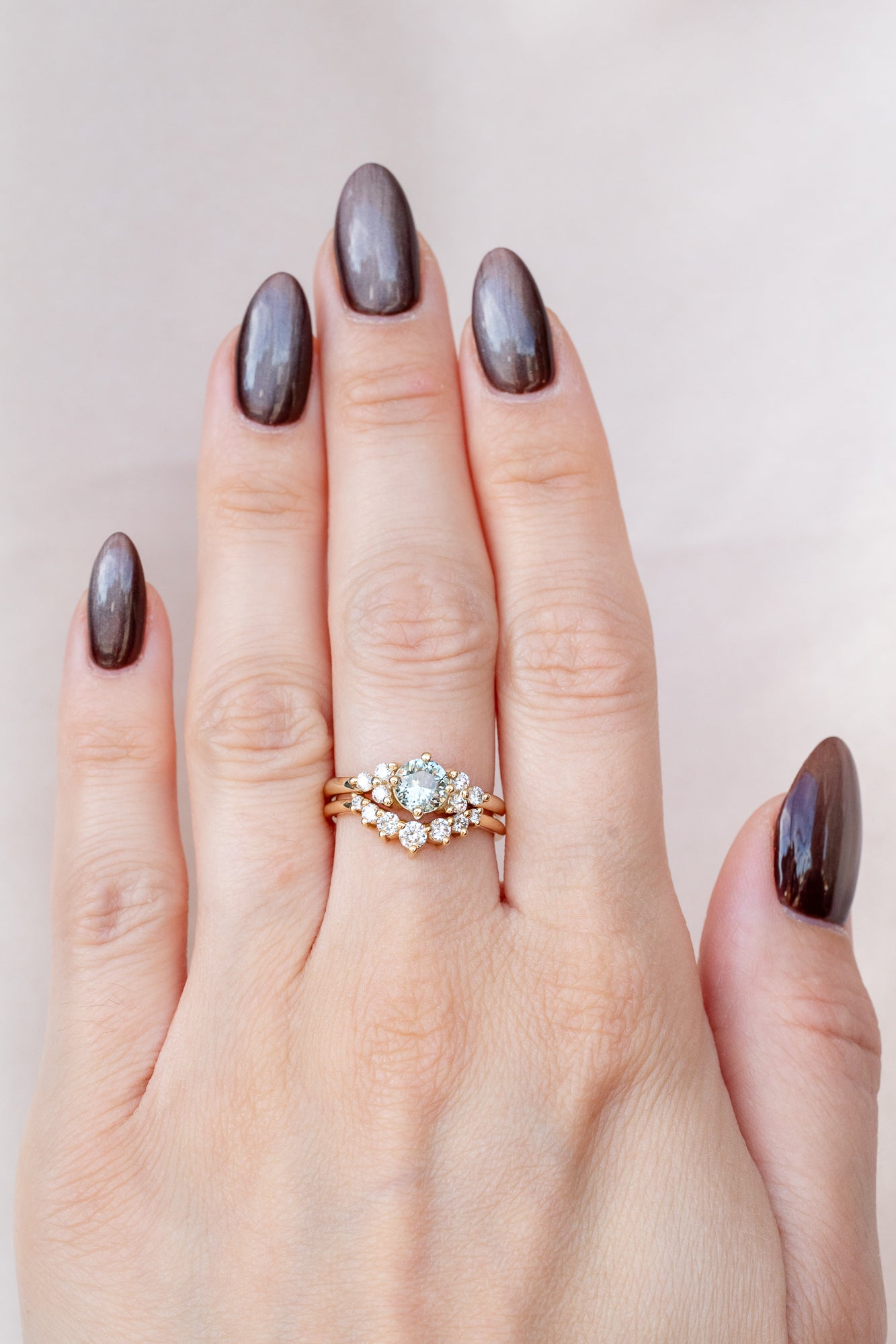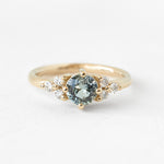 For this ring we've set a sea green Montana sapphire with diamonds trailing it on either side. Mined by our friends on the Eldorado Bar, these fascinating stones change color with the light as well. Learn more about Montana sapphires.