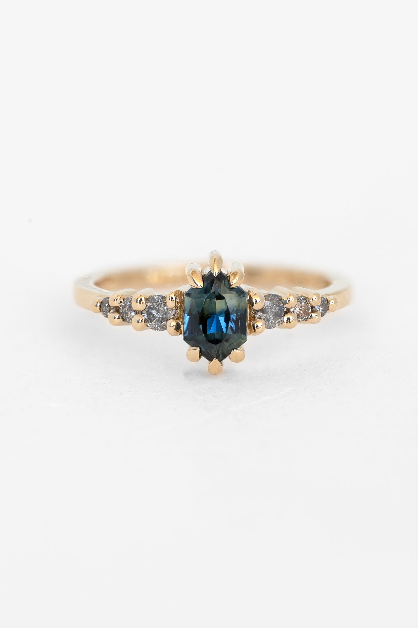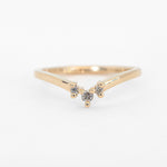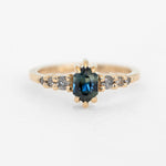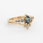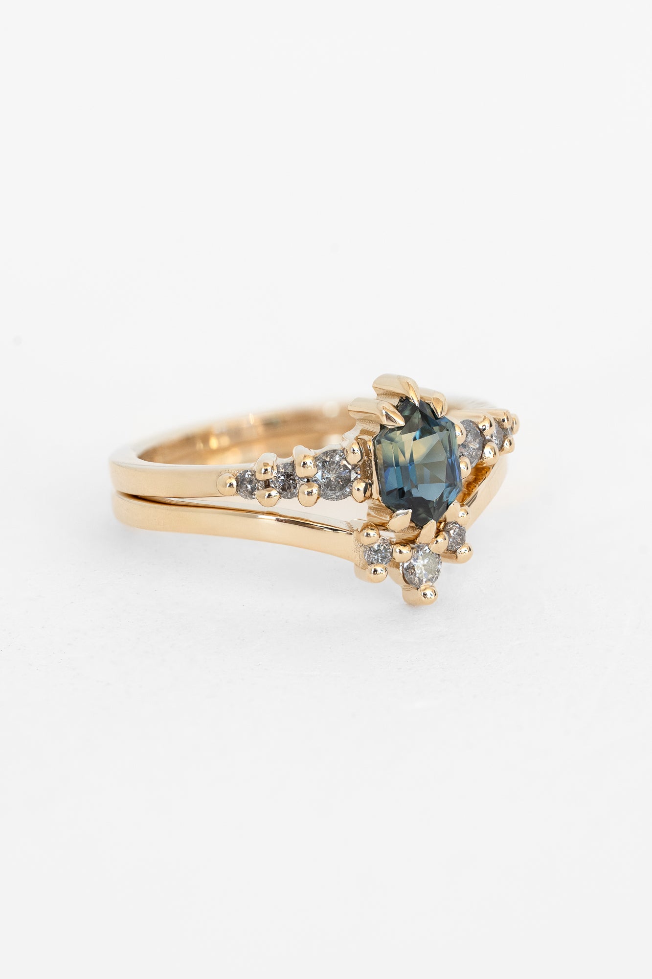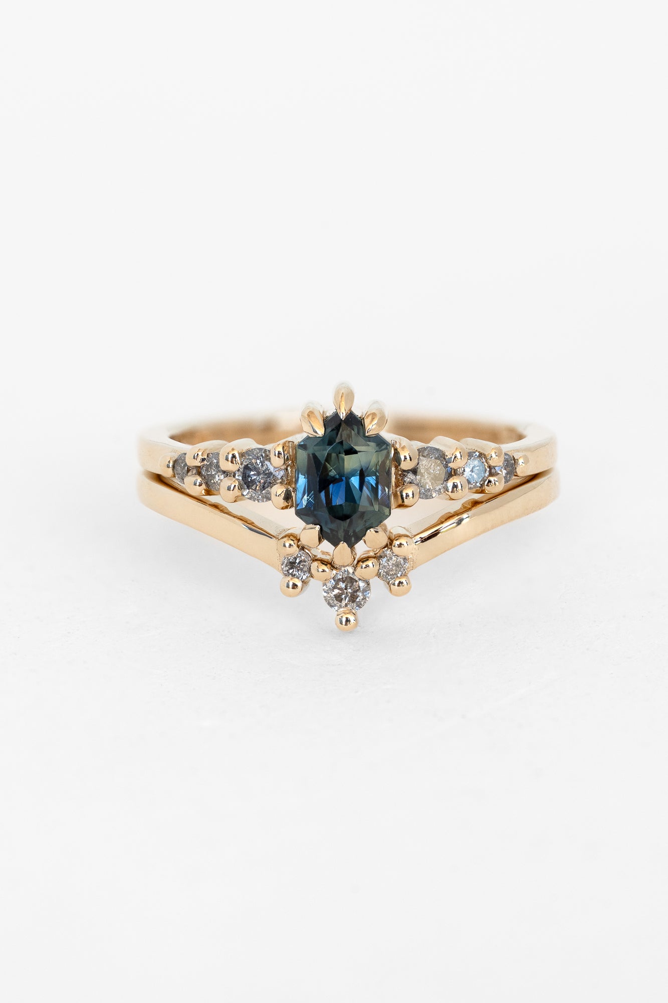 The centerpiece ring features a stunning Australian sapphire framed by a scattering of Salt and Pepper diamonds, while the contoured nesting band adds balance with its own trio of diamonds, creating a celestial silhouette. Worn together, the stack captures both strength and light - bold, dazzling, and timeless.