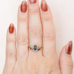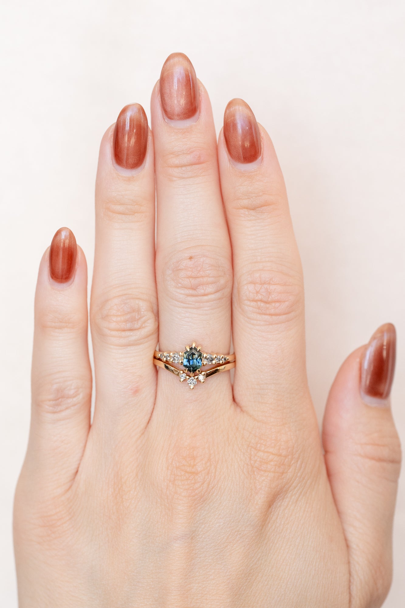 Brilliant and radiant, the Rigel Ring Stack shines like its namesake star - the brightest in the constellation Orion. This two-ring set pairs a deep blue-green sapphire with a crown of sparkling diamonds, matching the glow of a blue supergiant against the night sky.