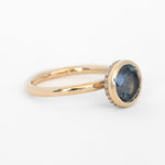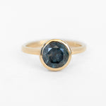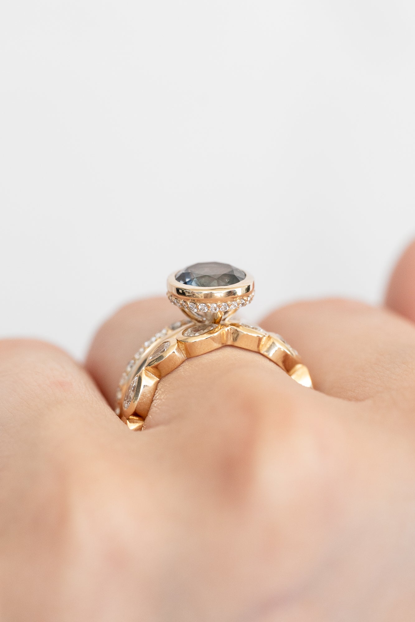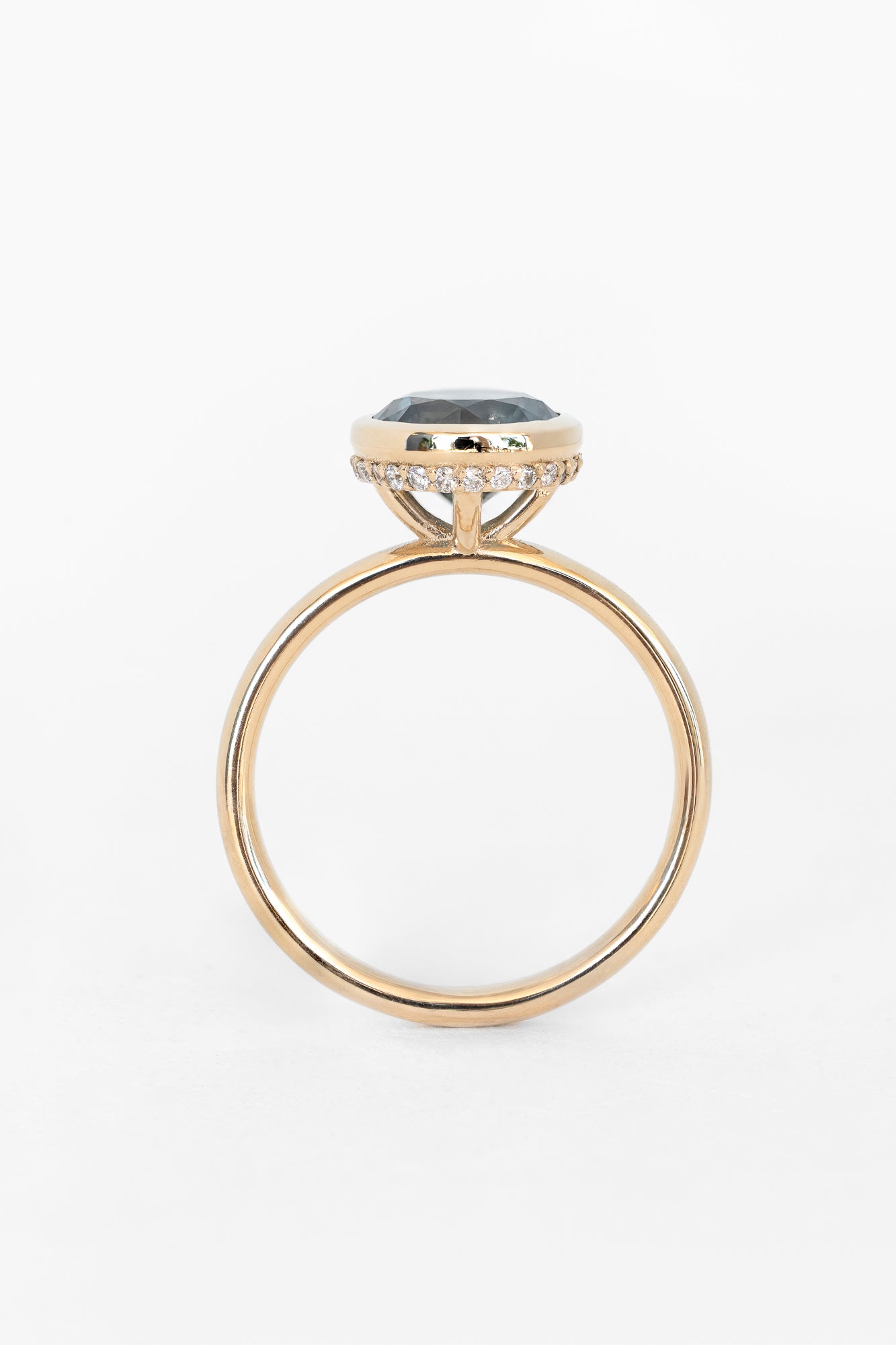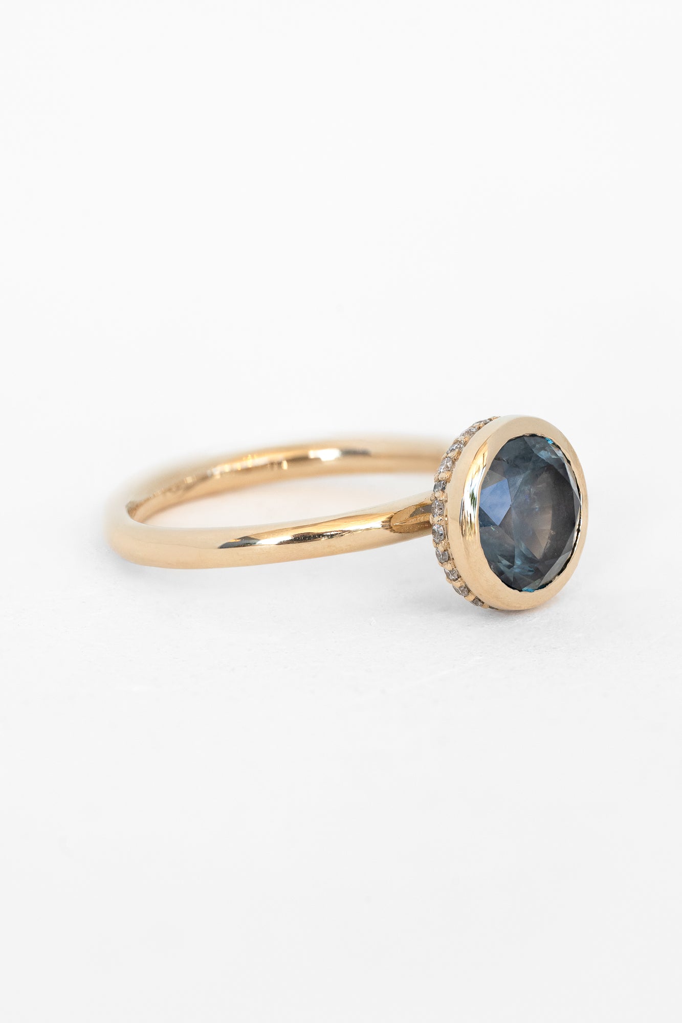 This minimalist beauty is fabulous, practical and even has a hidden surprise. A round-cut sapphire shines out from within a sleek bezel setting, accentuated by a delicate hidden halo nestled beneath a beautiful center stone.