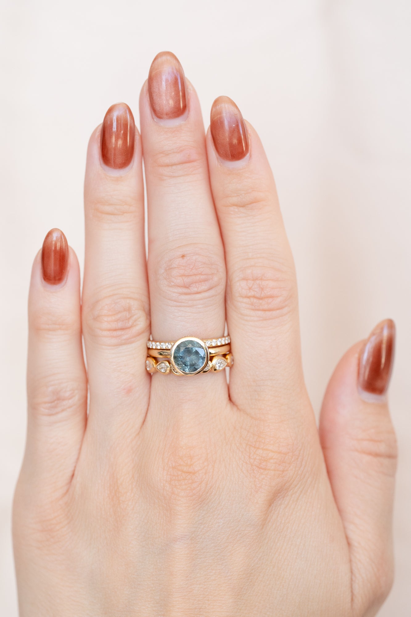 For this ring we've set a sea green Montana sapphire. Mined by our friends on the Eldorado Bar, these fascinating stones change color with the light as well. Learn more about Montana sapphires.