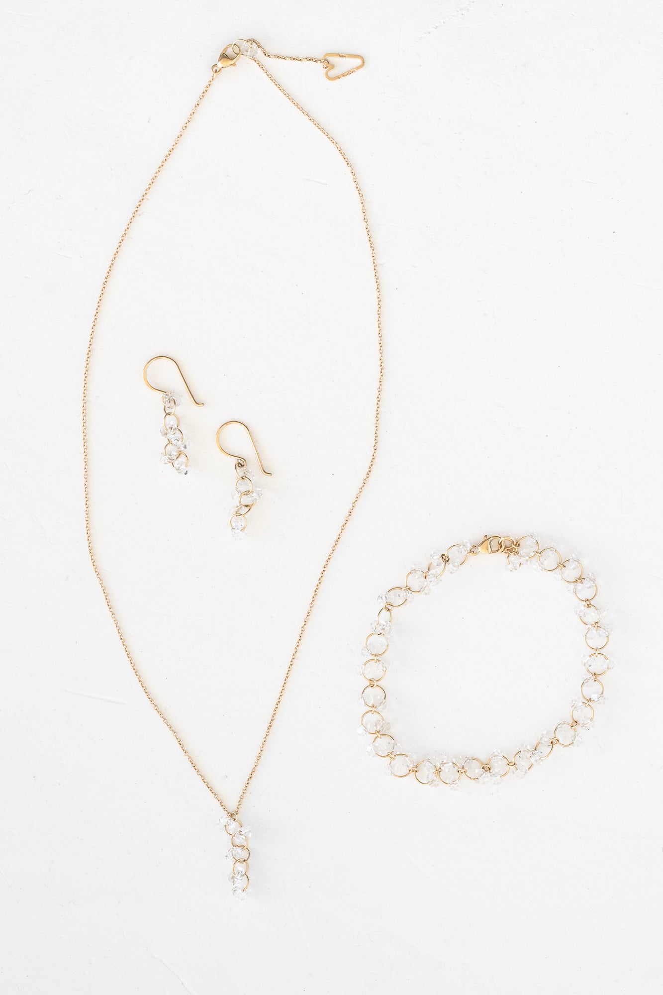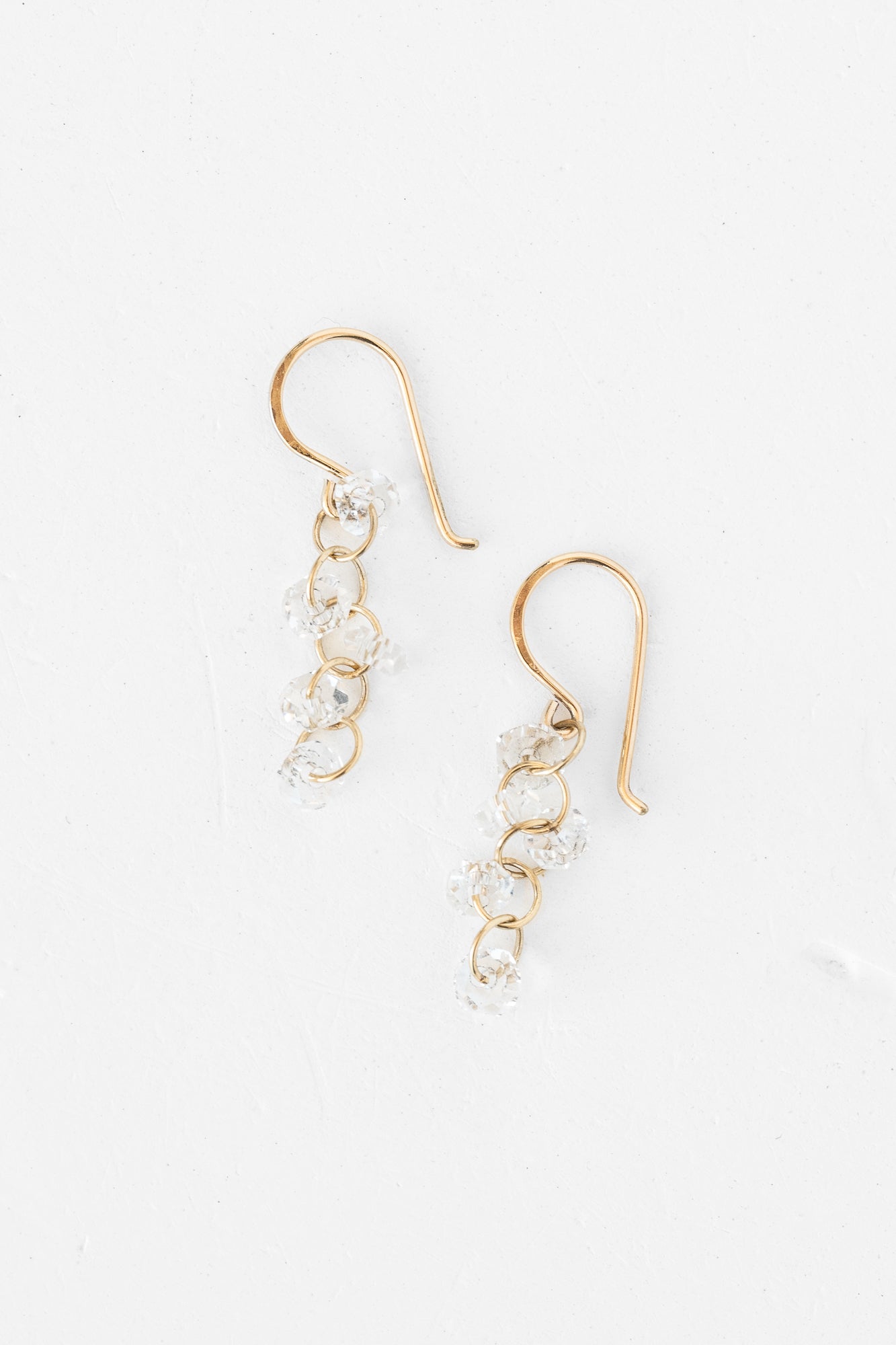 Sunshine as earrings, creating fluid movement that glitters as you move.. Soleil radiates light and movement with handmade gold links and glittering Herkimer diamonds (quartz), ethically mined in New York state. Playful and radiant, these designs sparkle with every step.