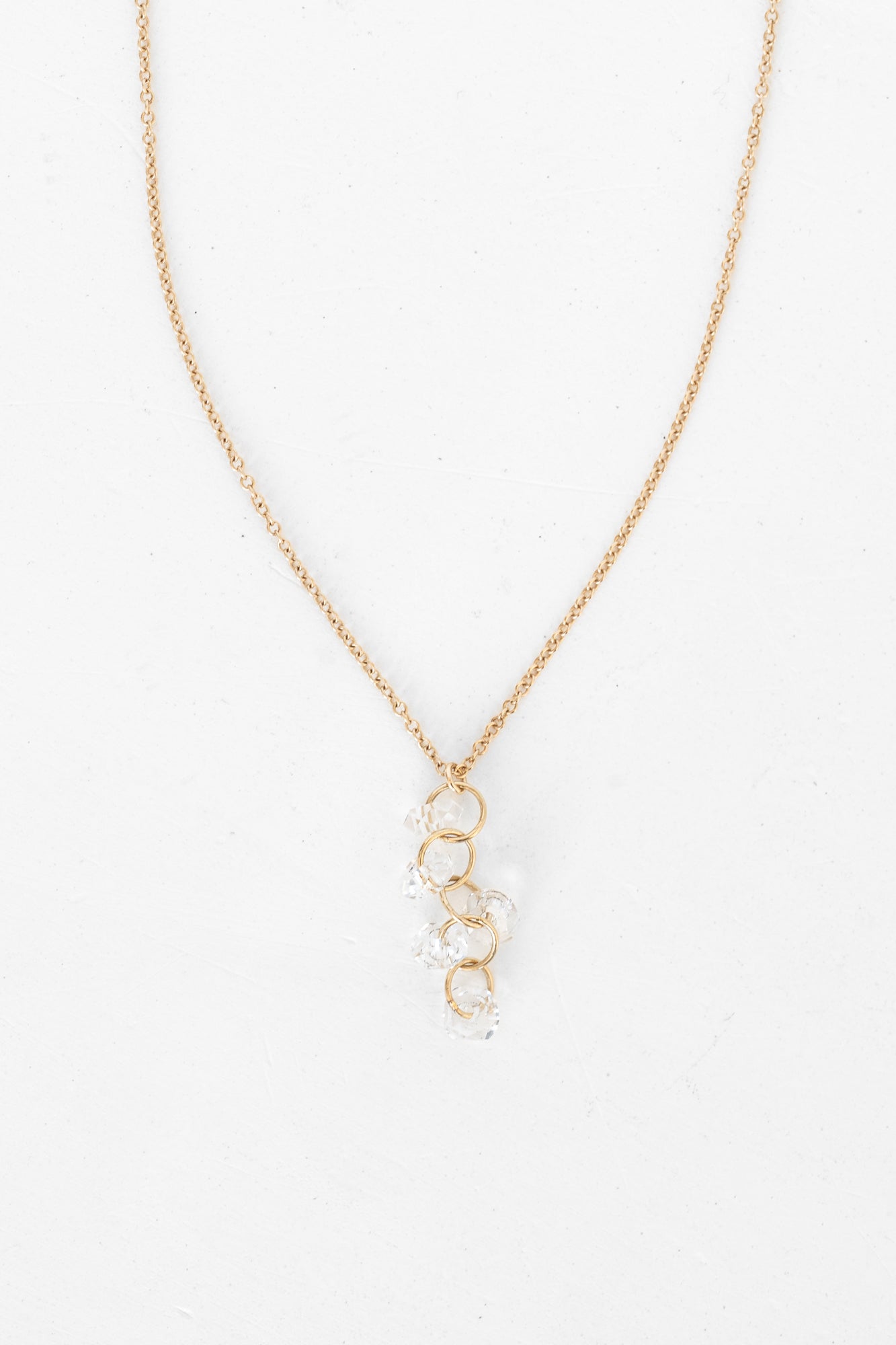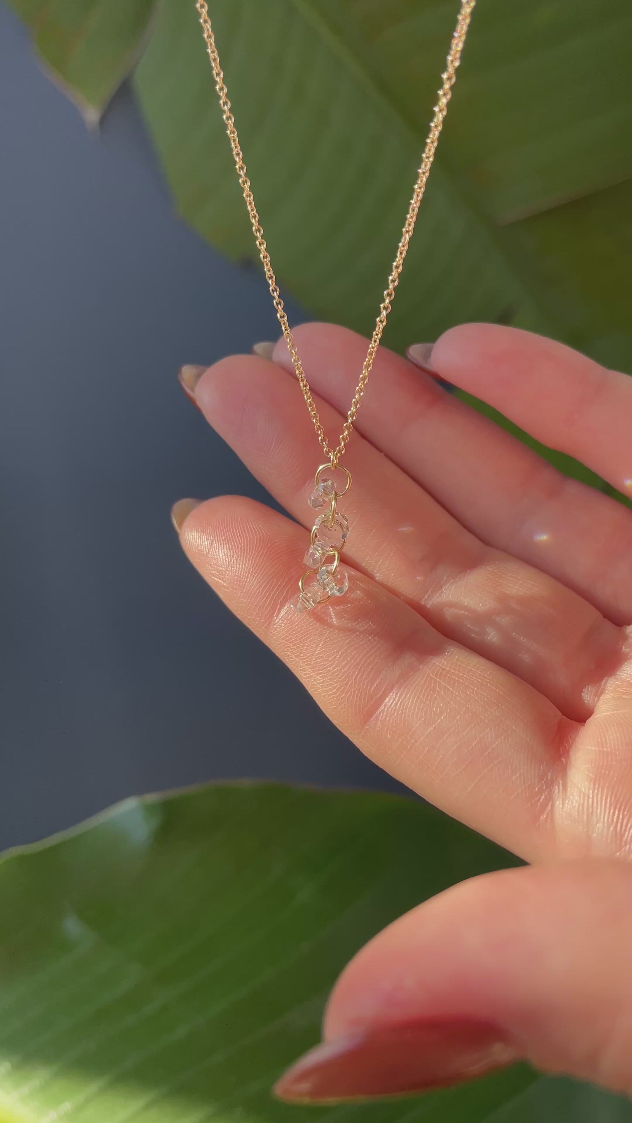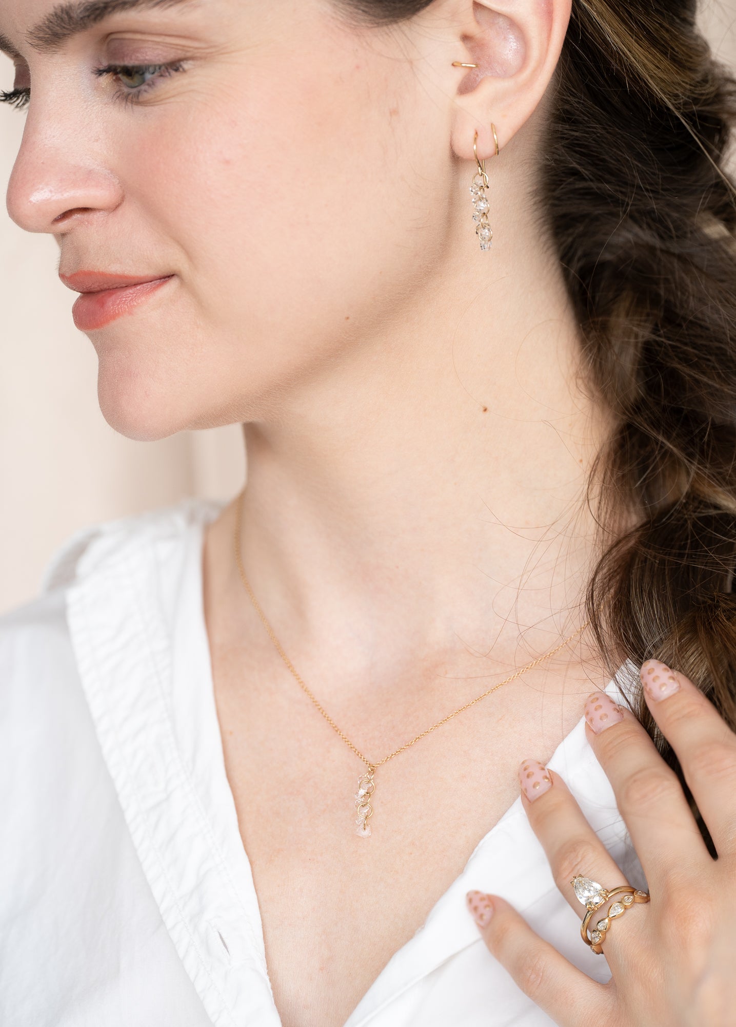 Sunshine as a necklace, with golden beams and crystalline drops. Soleil radiates light and movement with handmade gold links and glittering Herkimer diamonds (quartz), ethically mined in New York state. Playful and radiant, these designs sparkle with every step.