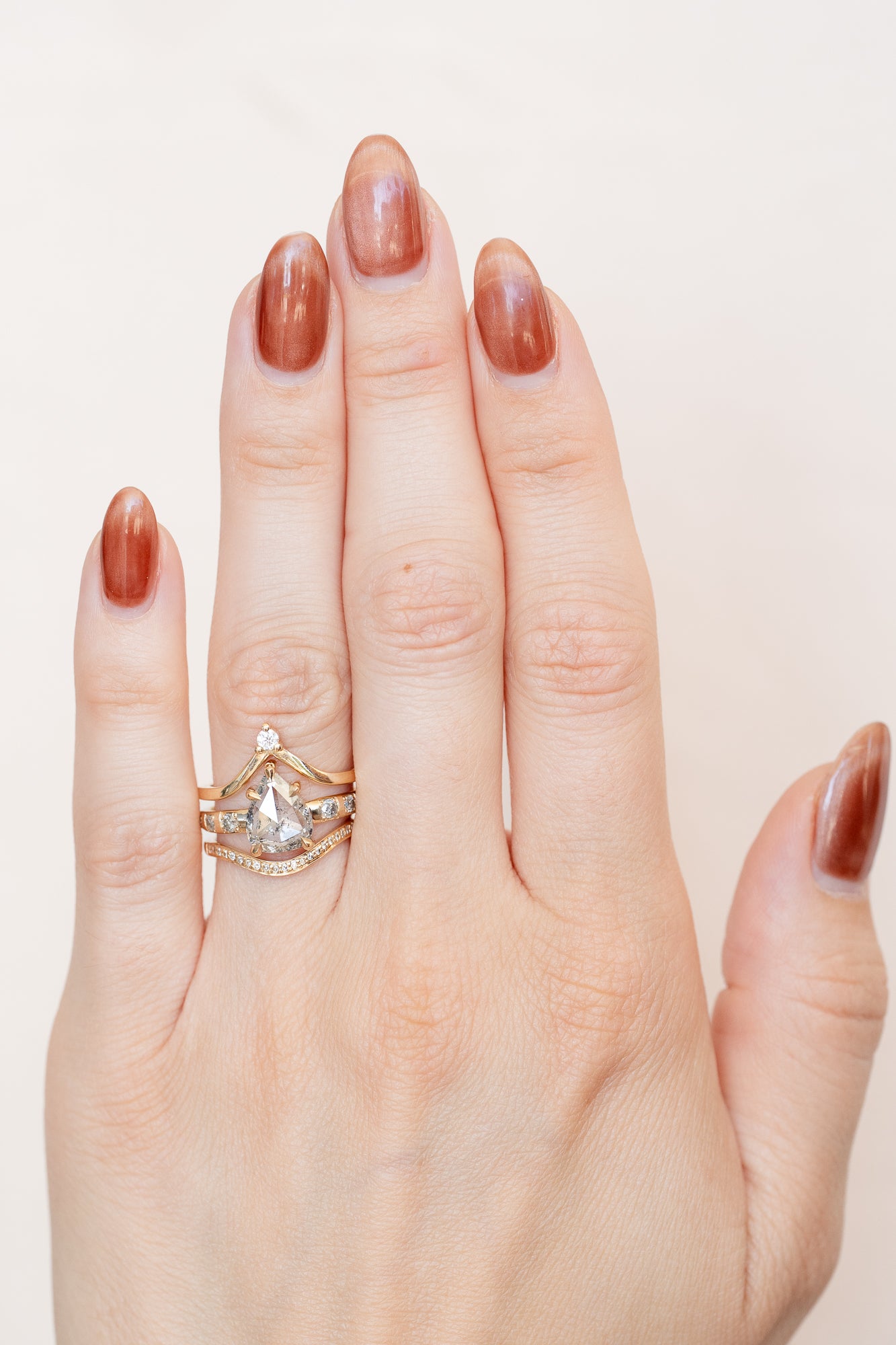 This Stella Ring features a lovely one of a kind, rose-cut Salt and Pepper diamond with pavé diamonds tapering along either side. A rose-cut stone is covered with small triangular facets across its entire top and is flat on the bottom allowing for a super low profile setting. Its faceting is meant to look like the swirling petals of a rose.